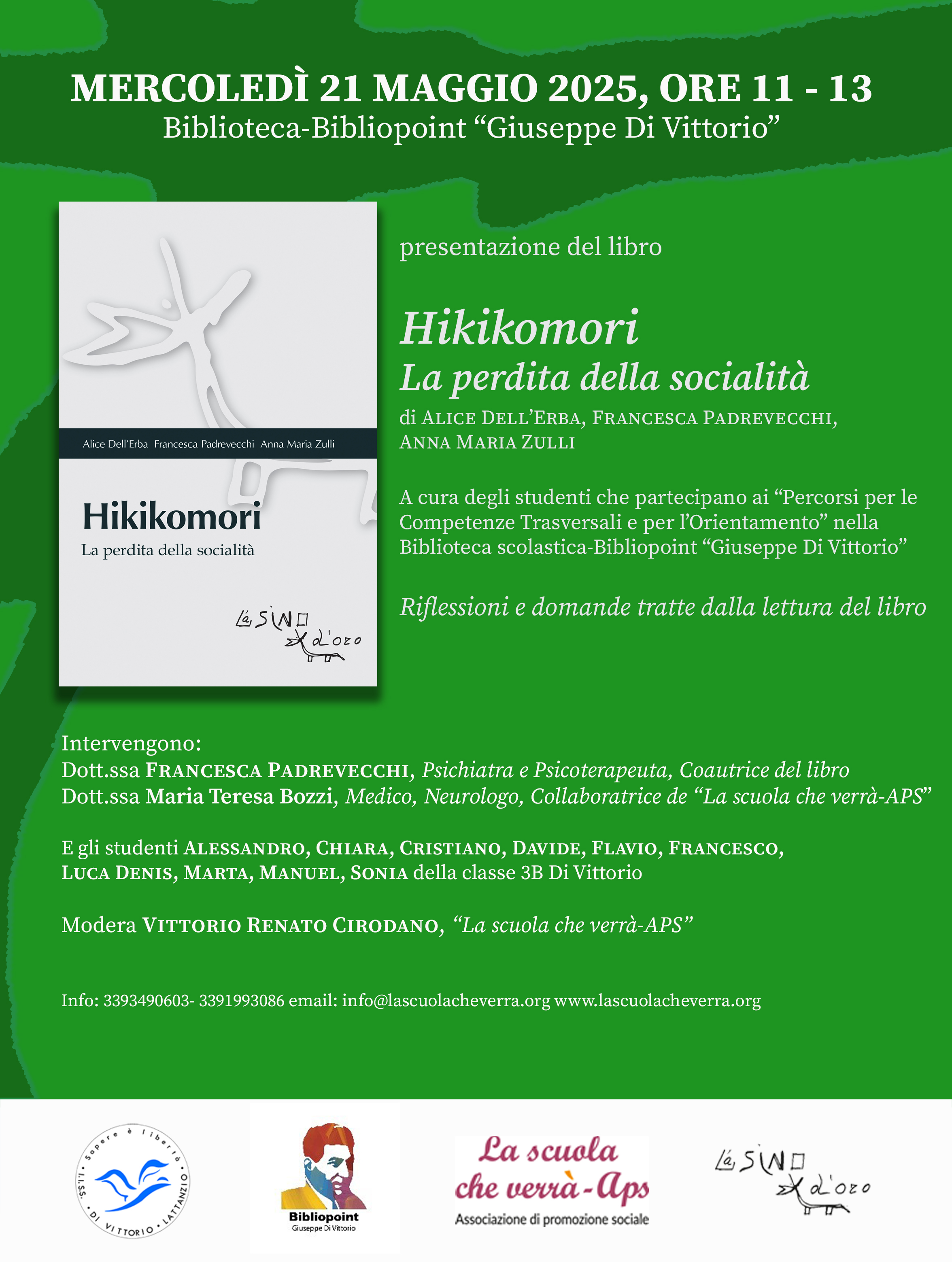 Si comunica che mercoledì 21 maggio p.v. si svolgerà presso il Bibliopoint “Giuseppe Di Vittorio” la presentazione del libro Hikikomori, la perdita della socialità, Edizioni L’Asino d’oro.