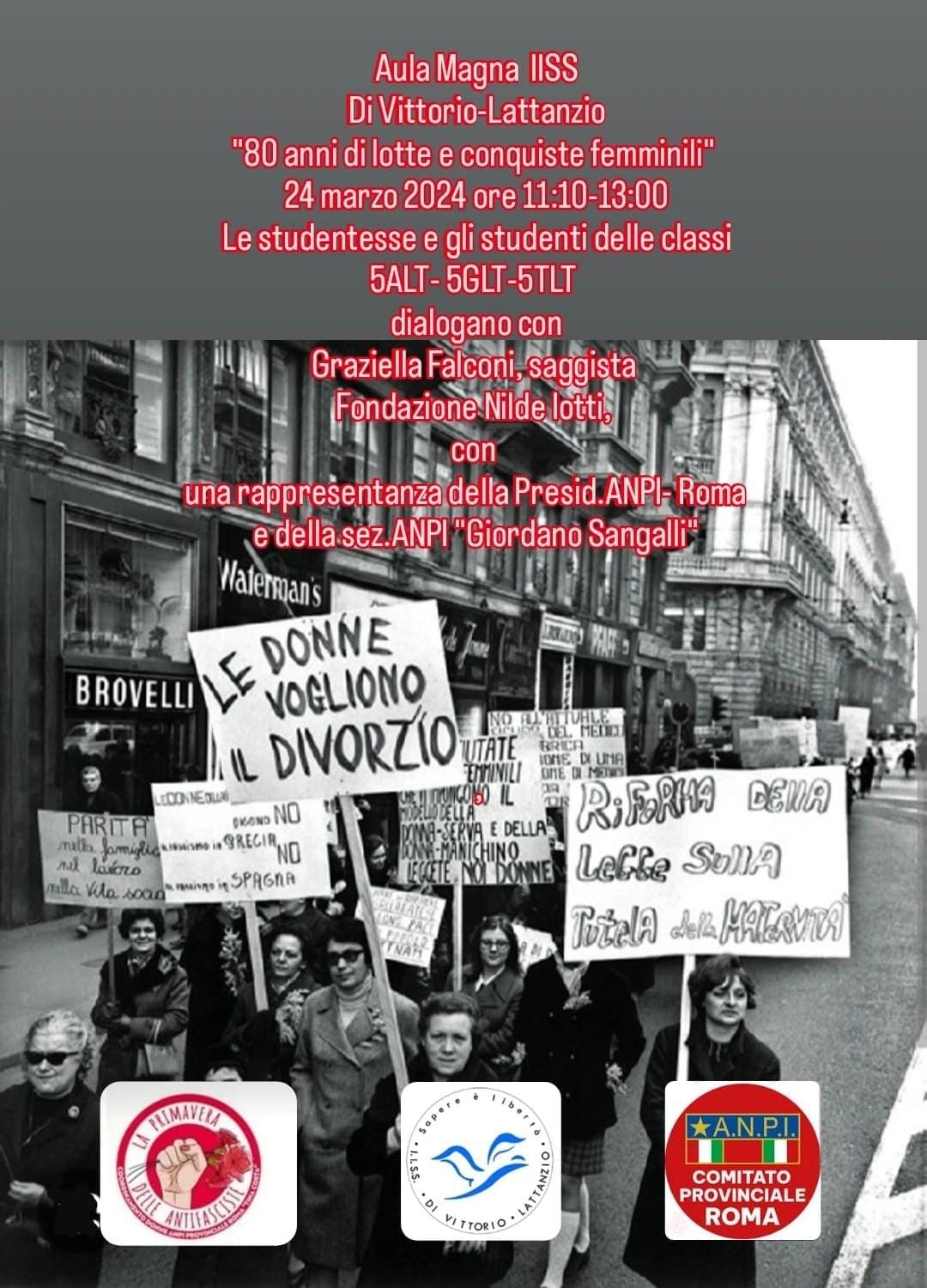 Nell' ambito del progetto le classi VA- VG e VT Lattanzio, lunedì 24 marzo dalle ore 11:10 alle 13:00, presso l' Aula Magna del nostro istituto, parteciperanno all'incontro con Graziella Falconi, saggista "Fondazione Nilde Iotti", con una rappresentanza della Presidenza ANPI Roma e con Caterina Busetta, della Sez. ANPI “Giordano Sangalli”, per approfondire la tematica affrontata nelle ricerche effettuate durante il progetto e riflettere insieme sul ruolo centrale che le donne hanno assunto nella storia, anche se sui libri appaiono occasionalmente.