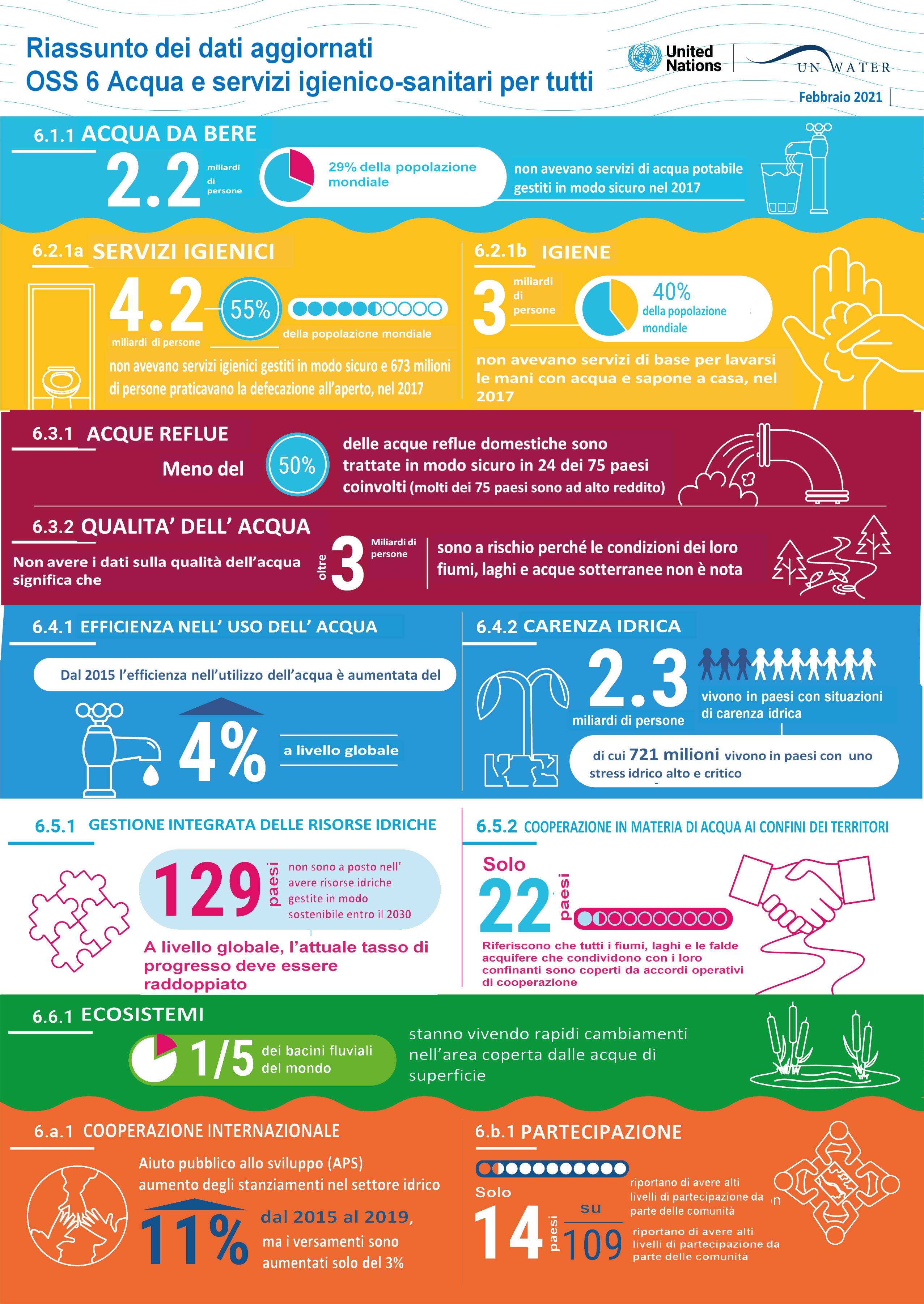 Garantire a tutti la disponibilità e la gestione sostenibile dell’acqua e delle strutture sanitarie è il sesto dei 17 obiettivi di sviluppo sostenibile (OSS) dell’ Agenda 2030, obiettivi da raggiungere entro il 2030 mettendo in atto un processo di cambiamento del modello di sviluppo che viene continuamente monitorato attraverso una serie di indicatori. Periodicamente, con l’analisi dei parametri sottoposti a studio, ciascun Paese viene valutato in sede ONU.