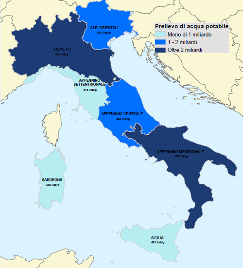 Prelievi di acqua per uso potabile per distretto idrografico, in Italia. Anno 2018