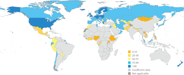Percentuale di popolazione che utilizza servizi di acqua potabile gestiti in modo sicuro (2017). (Fonte:Rapporto UN-WATER 2021)