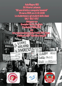 Nell' ambito del progetto le classi VA- VG e VT Lattanzio, lunedì 24 marzo dalle ore 11:10 alle 13:00, presso l' Aula Magna del nostro istituto, parteciperanno all'incontro con Graziella Falconi, saggista "Fondazione Nilde Iotti", con una rappresentanza della Presidenza ANPI Roma e con Caterina Busetta, della Sez. ANPI “Giordano Sangalli”, per approfondire la tematica affrontata nelle ricerche effettuate durante il progetto e riflettere insieme sul ruolo centrale che le donne hanno assunto nella storia, anche se sui libri appaiono occasionalmente.