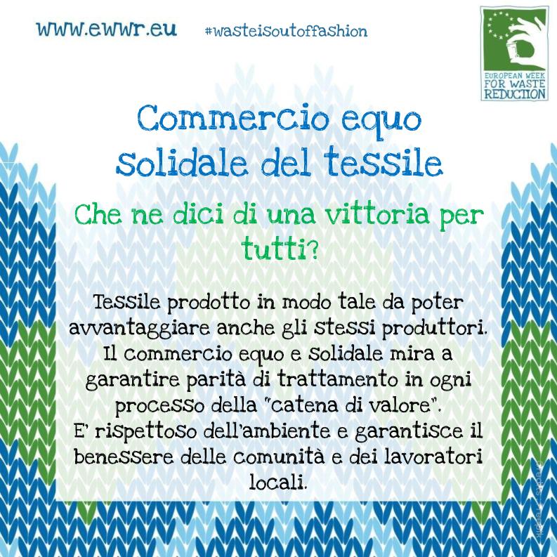 La campagna di comunicazione ambientale della SERR è volta a promuovere tra i cittadini una maggiore consapevolezza sulle eccessive quantità di rifiuti prodotti e sulla necessità di ridurli drasticamente. Anche quest’anno il nostro istituto aderisce alla campagna, proponendo degli spunti di riflessione sui rifiuti tessili, focus tematico del 2022. Con il motto Tessile, circolare e sostenibile: “I rifiuti sono fuori moda!”, la settimana è dedicata alla sensibilizzazione sull’impatto che i tessili hanno a livello ambientale. Dalla produzione alla distribuzione, all’uso e al consumo che ne viene fatto, il settore tessile è uno dei più inquinanti. Inoltre, dal 1° gennaio 2022, con il d.L. 116/2020 è in vigore l’obbligo della raccolta differenziata dei materiali tessili.