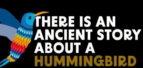 Un giorno nella foresta scoppiò un incendio. Tutti gli animali correvano per salvarsi la vita. Rimasero ai margini del fuoco, guardando le fiamme con terrore e tristezza. Sopra le loro teste, un colibrì volava avanti e indietro verso il fuoco, ancora e ancora. Gli animali più grandi chiesero al colibrì cosa stesse facendo. «Sto volando al lago per prendere l’acqua per spegnere l’incendio». Gli animali risero di lui e dissero: «Sei pazzo, non puoi spegnere questo fuoco!». Il colibrì rispose: «Sto facendo quello che posso».