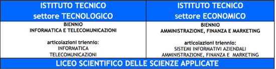 SE PENSO DI AVER SBAGLIATO INDIRIZZO E VORREI CAMBIARLO COME POSSO FARE'? DEVO CAMBIARE SCUOLA O POSSO CAMBIARE INDIRIZZO ALL'INTERNO STESSO DELLA SCUOLA ? PUOI CAMBIARE INDIRIZZO ALL'INTERNO DELLA SCUOLA ENTRO IL PRIMO BIENNIO: BASTA PRESENTARE UNA DOMANDA E SOSTENERE UN COLLOQUIO PER LE MATERIE DELL’ ALTRO INDIRIZZO. I RITARDI SARANNO RECUPERATI NEL CORSO DELL’ANNO DOPO ESSERE STATI INSERITI NELLA UNA NUOVA CLASSE. QUANDO HO TERMINATO IL SECONDO ANNO DI SUPERIORI COME MI ORIENTO PER LA SCELTA DELL'INDIRIZZO DEFINITIVO CHE MI PORTERA' A CONSEGUIRE IL DIPLOMA? DURANTE IL SECONDO ANNO PARTECIPI A UNA SERIE DI INCONTRI E SEMINARI TENUTI DAI PROFF DELLE MATERIE DI INDIRIZZO E DA ESPERTI CHE TI SPIEGHERANNO GLI ASPETTI CARATTERIZZANTI L'INDIRIZZO CHE HAI INTENZIONE DI SCEGLIERE COME FUNZIONANO I PERCORSI P.C.T.O. (EX-L'ALTERNANZA SCUOLA LAVORO)? L’ASL ORA SI CHIAMA PCTO (PERCORSO PER LE COMPETENZE TRASVERSALI E PER L’ORIENTAMENTO) LE ATTIVITA' SONO DIVERSIFICATE E COMINCIANO NEGLI ULTIMI TRE ANNI DI FREQUENZA: LE ORE SONO 150 PER I TECNICI E 90 PER IL LICEO VAI DIRETTAMENTE SUL SITO DELLA SCUOLA SEZIONE ALTERNANZA SCUOLA LAVORO: TROVERAI LE TANTE ESPERIENZE ED I PERCORSI REALIZZATI DAI NOSTRI ALUNNI. CHE SBOCCHI PROFESSIONALI POSSO AVERE ? IL DIPLOMA PER L’INDIRIZZO INFORMATICA E TELECOMUNICAZIONI CONSENTE L'IMPIEGO NELL'INDUSTRIA E IN SOCIETÀ CHE SI OCCUPANO DI INFORMATICA, TELEFONIA E TELECOMUNICAZIONI, COMPRESE QUELLE CHE GESTISCONO IMPIANTI DI PUBBLICA UTILITÀ (TELECOM, ENEL, ECC.) IL DIPLOMA IN ECONOMIA FINANZA E MARKETING CONSENTE L'IMPIEGO PRESSO ISTITUTI BANCARI IMPRESE PRIVATE IMPRESE E PUBBLICHE AMMINISTRAZIONI UTILIZZATRICI DI NUOVE TECNOLOGIE UFFICI LEGALI AZIENDE DI TRASPORTO, IMPORT EXPORT QUALI FACOLTA' UNIVERSITARIE POSSONO ESSERE FREQUENTATE? POSSONO ESSERE FREQUENTATE TUTTE LE UNIVERSITA'. RECENTI DATI RIPORTANO CHE I DIPLOMATI NEL LICEO SCIENTIFICO SCIENZE APPLICATE SUPERANO PIù FACILMENTE, RISPETTO A QUELLI DEL LICEO SCIENTIFICO TRADIZIONALE, I TEST DI AMMISSIONE A FACOLTA' COME MEDICINA.